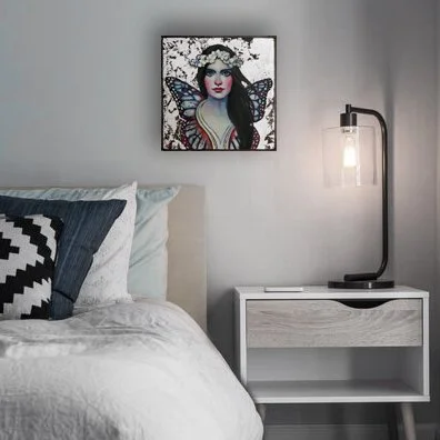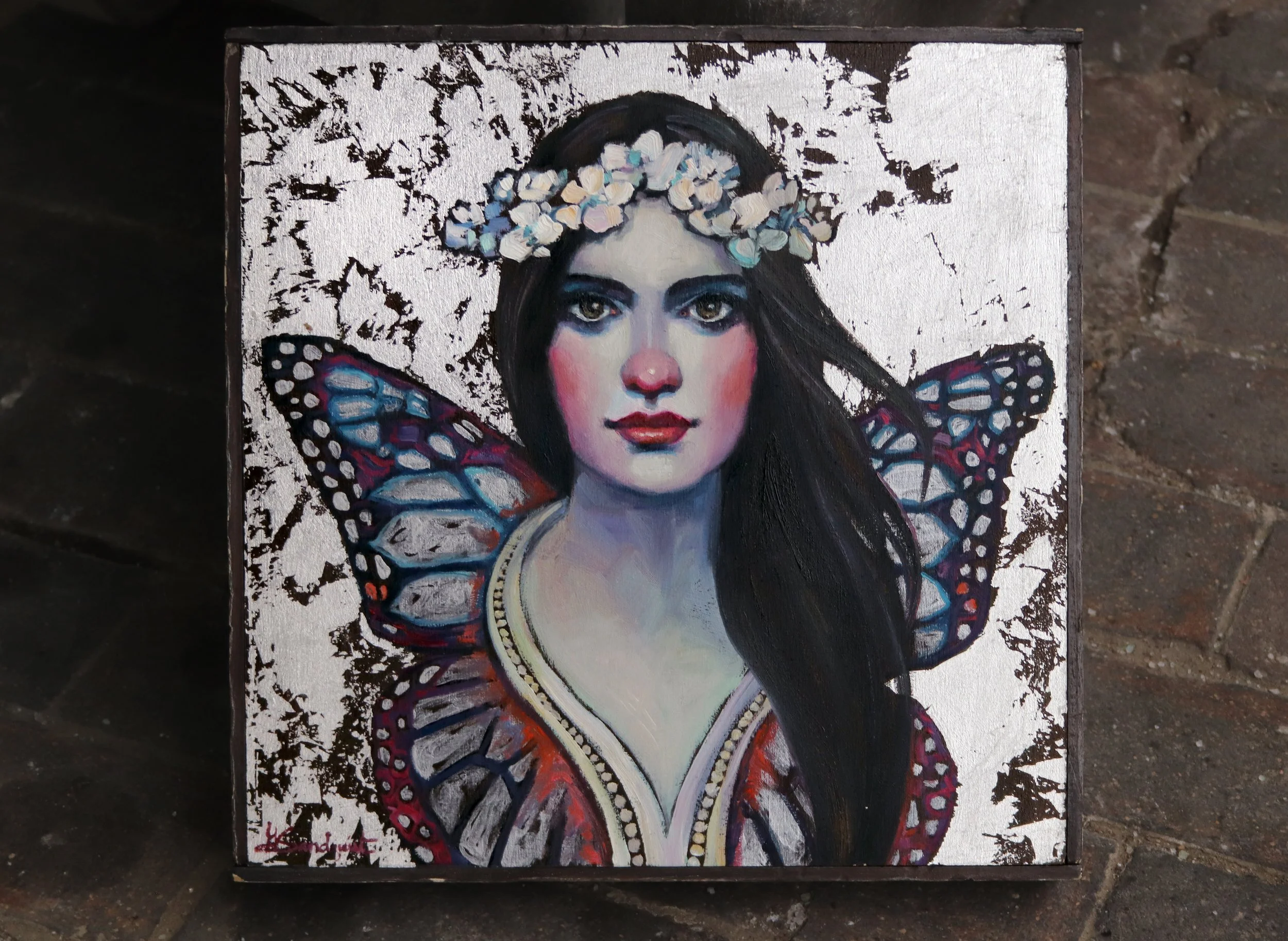 Oil paint and silver leaf on cradled wood panel. This piece is set in an understated and elegant frame. The wood is finished in a rich espresso color that compliments any décor.